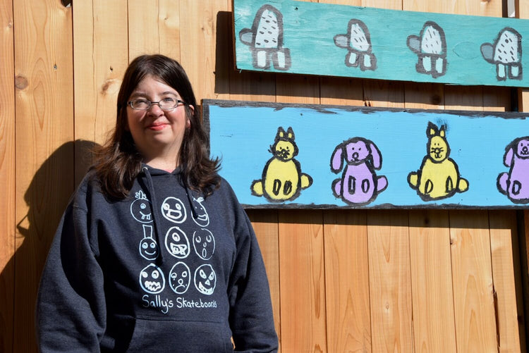 Megan “Sally” Brieno grew up in Sacramento, California where her love and passion for art started to develop. She recently moved to Oregon in September 2019 to live with her brother, Bryan Nichols, the owner of the ZuhG Life Surf Shop in Lincoln City. The surf shop is also where Megan sells various forms of her art. She has small-framed items of her colorful sketches, large-scale paintings, stickers, a greeting card rack, and even apparel under the clothing line name of “Sally’s Skateboards.” Her art has been featured for a show at Black Squid and has most recently been featured in the largest publication on the Oregon coast labeled “Oregon Coast Today.” Megan practices drawing for several hours every day, using various kinds of mediums to perfect her craft. In her spare time when she’s not drawing, she loves making jewelry, training her beloved betta fish “Daisy”, working out to her favorite Youtube star Pamela Reif, meditating, baking in the kitchen, and playing with her dogs Luna & Ruca.