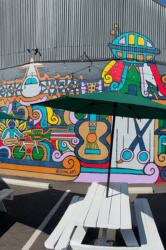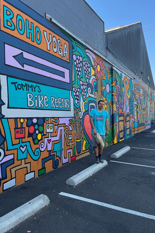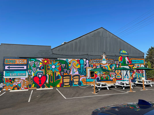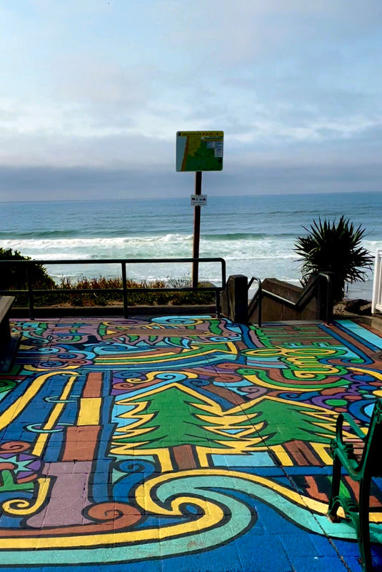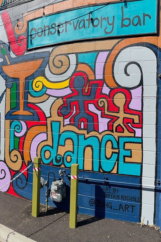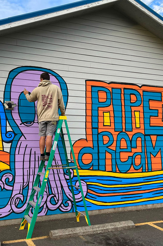 Bryan Nichols is an artist based on the Oregon Coast. His mediums primarily consist of acrylic paint on canvases, walls, instruments, surfboards, and wood. From his experience as a professional musician in a band named “ZuhG.” to designing small-scale stickers and logos, and most recently expanding his work to murals, Nichols continues to evolve how he expresses himself creatively. Nichols is responsible for painting the wall that serves as the backdrop to The Pines Dine Food Cart Village in Taft, the ground mural at 26th St. Beach Access, the sizable mural on the Conservatory Bar building in McMinnville, and the side of the Pipe Dreams building.