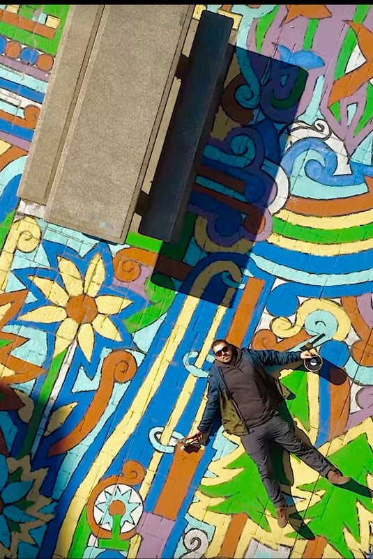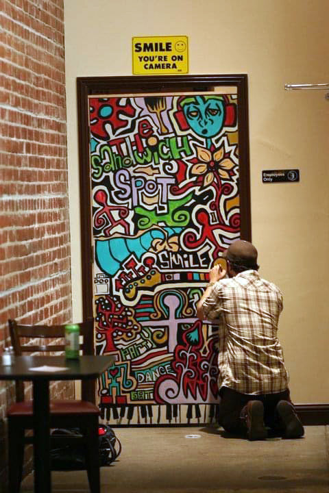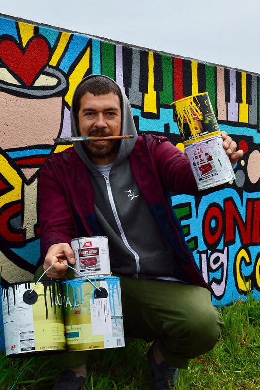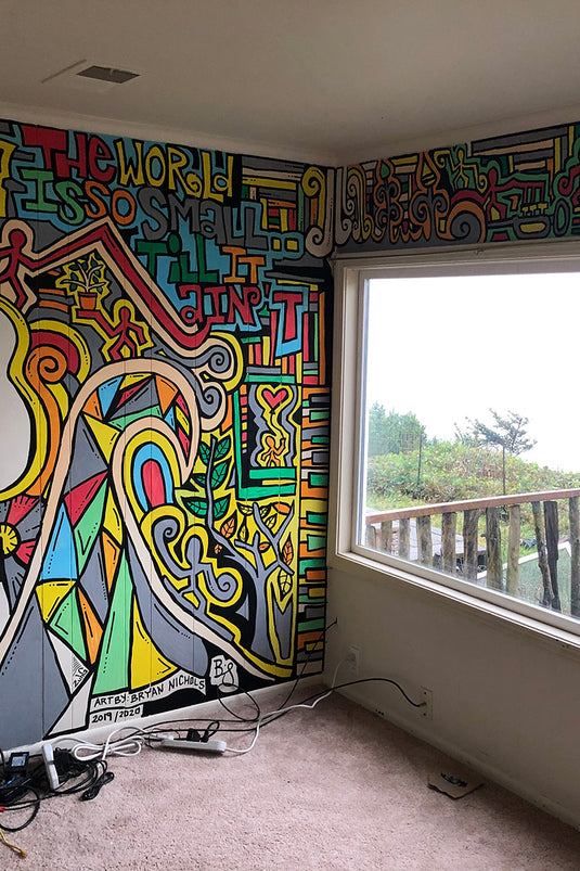 Originally from Sacramento, California, Bryan started the band “ZuhG.” meaning ‘to be unlike others’. As the lead singer and songwriter for the reggae-rock band, he often weaves in his characteristic style of vibrant colors and swirling lines with elaborate block coloring on various instruments like his upright bass or his band’s drum set. He even used their “ZuhG bus” that they toured with across the country as a canvas.